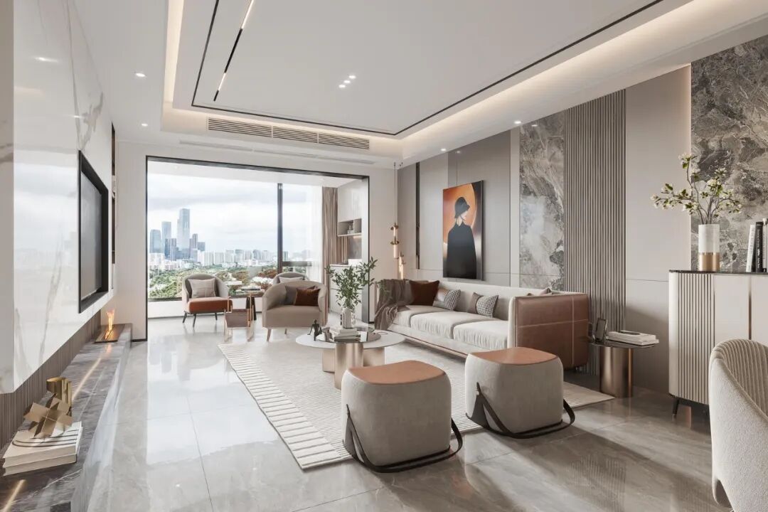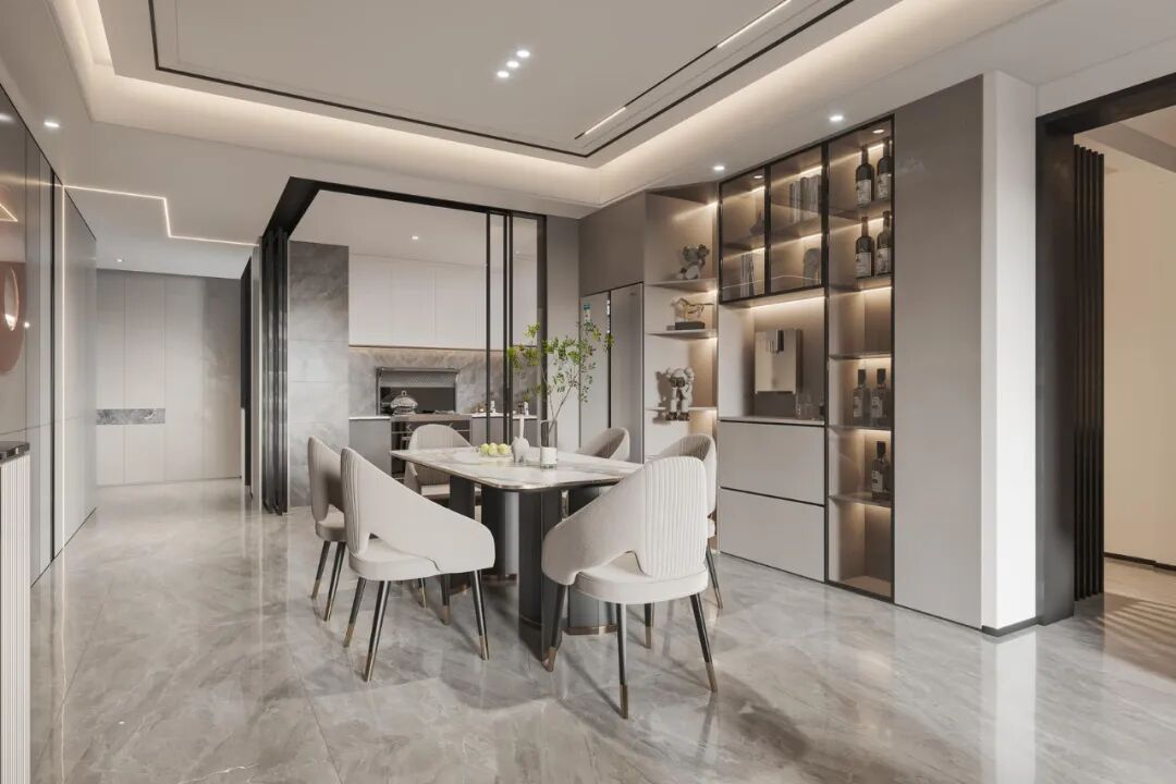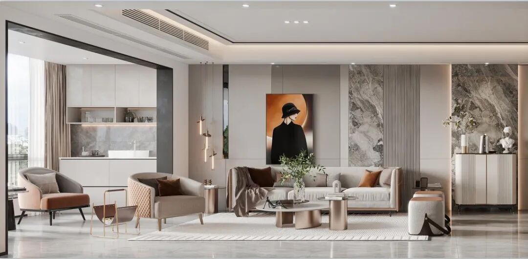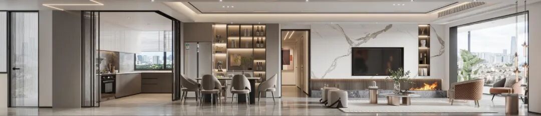 客厅以高级灰轻奢风格为框架,融入轻奢的金属质感,灯光配置上采用多种局部照明组合的设计,电视背景墙下的隐藏灯带、嵌入墙体的线性灯条,无主灯的简约光源,明暗关系的调控营造出居室氛围的层次感,消除空间的疏离清冷,赋予温馨的惬意。![]()