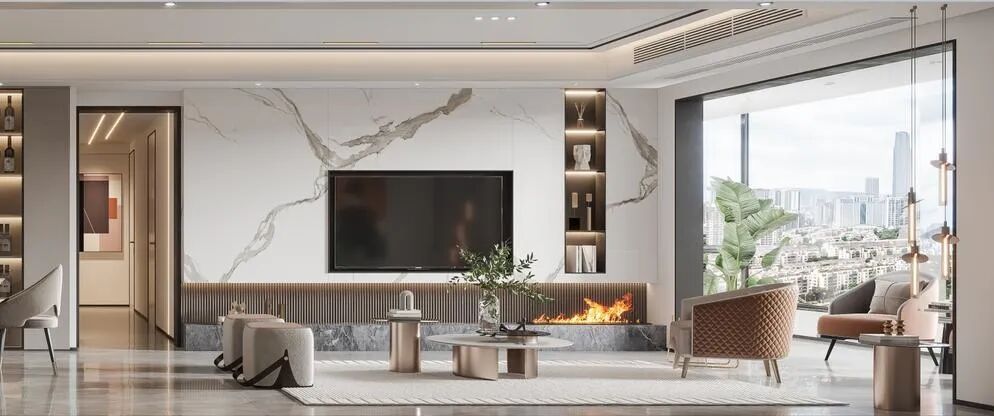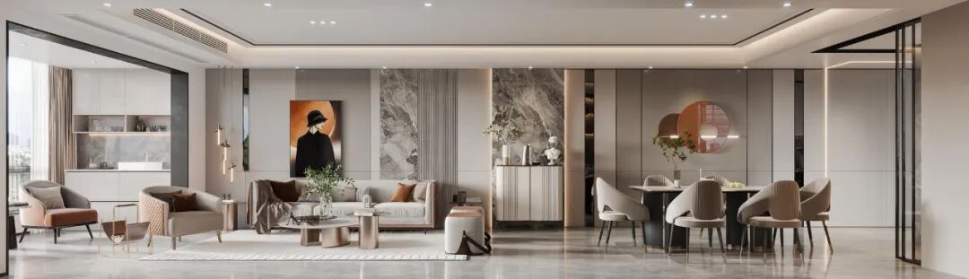 电视背景墙使用错落有致的线条造型木格栅护墙板立体饱满的视觉效果,沙发背景墙使用了装饰硬包立体富有质感柔和感。都结合岩板增加了丰富的光影效果。保留了大气高级的场面,也不失居住的舒适性;极大程度地丰富了现代空间的表情符号。![]()