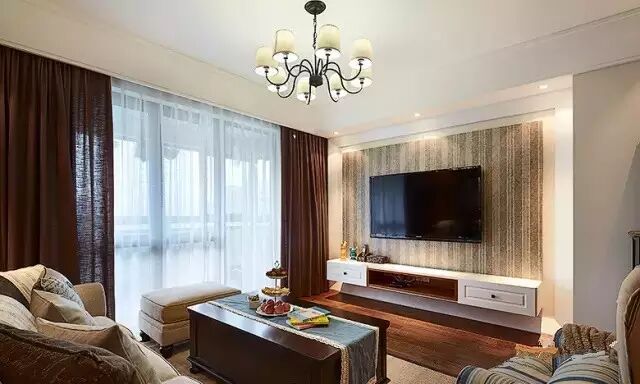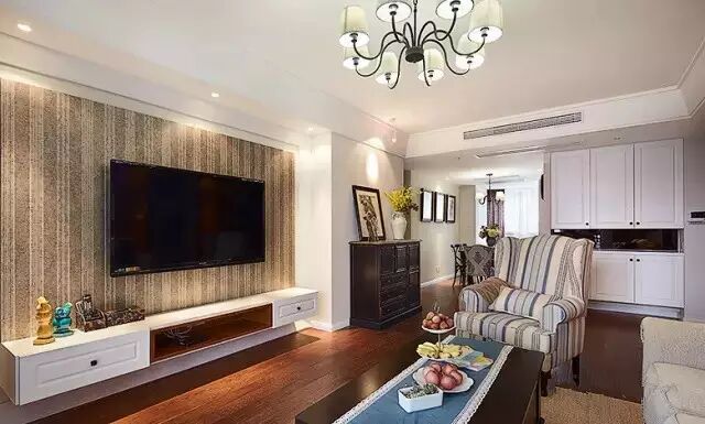 电视背景墙用灰色的条纹壁纸铺贴,竖直的条纹能拉伸客厅的高度,更显得宽敞明亮。