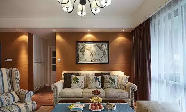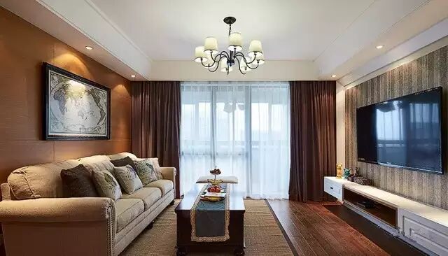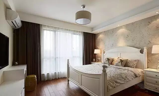 全白色的家装设计中间咖色窗帘变成了点缀,共同构成最经典的颜色搭配,让房间体现一片和谐。