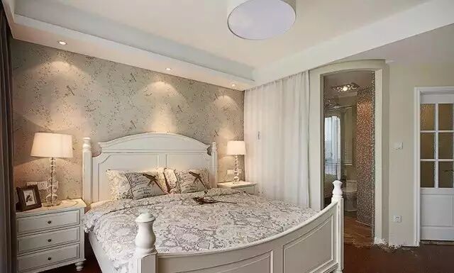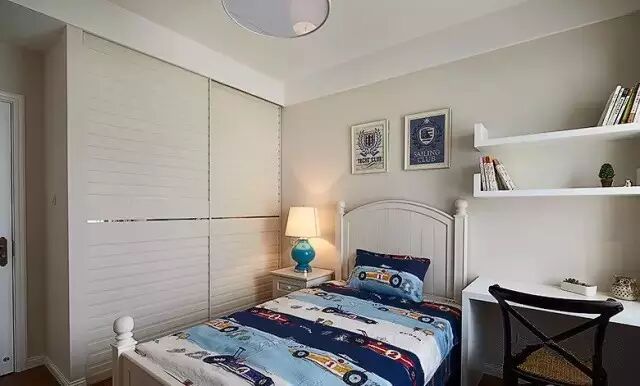 褪去所有繁杂颜色,留下最经典的白色,同时选择蓝色床品,为整个空间增添些明快感。
