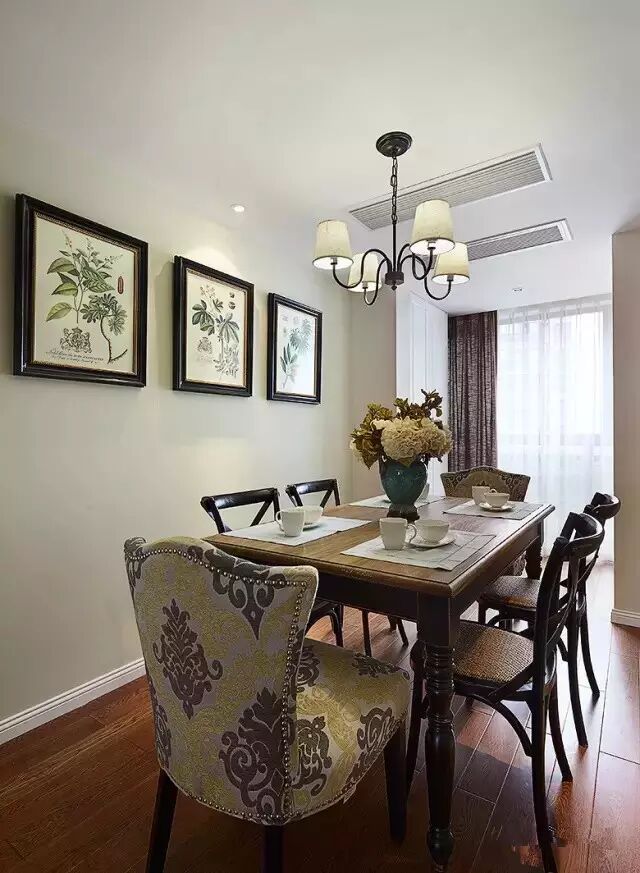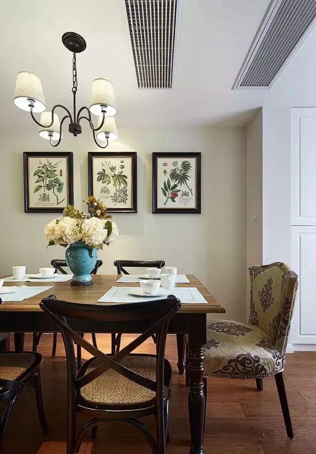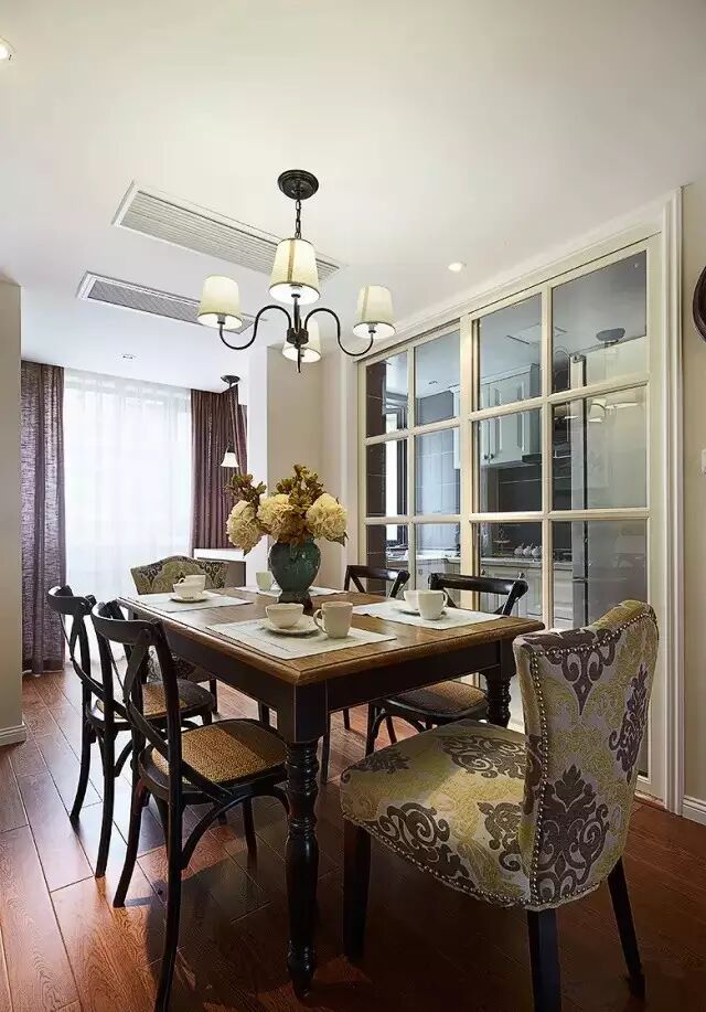 餐厅空间比较“瘦”,大而厚重的美式家具显然不适合,简单精致的造型更实用。