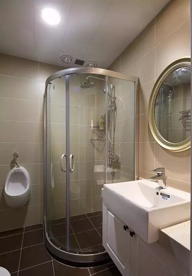 金属色边框的镜面让卫生间具有了一种复古韵味,小便池实在是贴心的考虑。