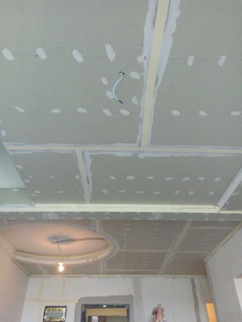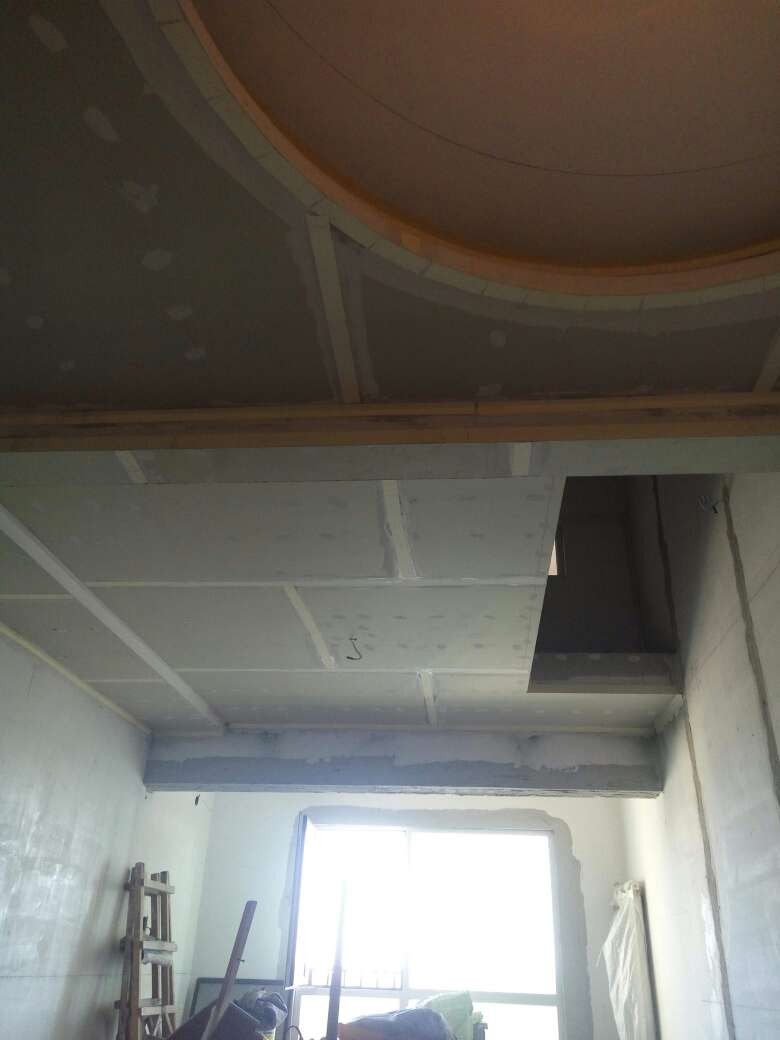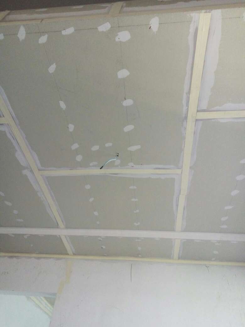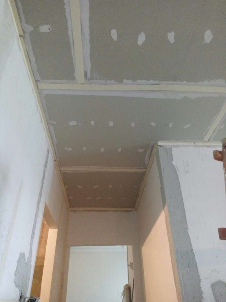 今日吊顶验收,检查房间各部位吊顶高度,封板,自攻钉等各项施工符合工艺要求,材料为可耐福龙骨及可耐福石膏板。另房间局部做抗裂处理,厨卫轻体砖包下水管道,施工正常,验收通过。